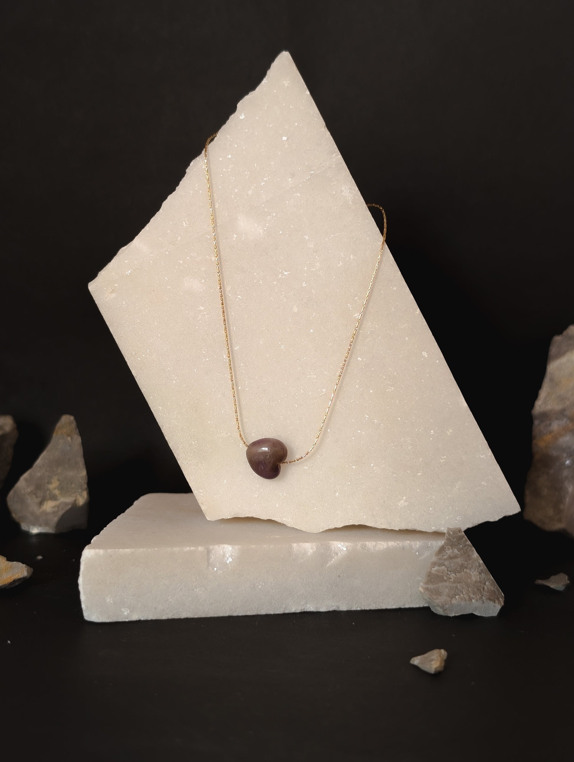 Soft yet powerful, the rich purple crystal symbolizes intuition, love, and cosmic connection, while the barely-there chain allows the pendant to float effortlessly against the skin — like a star resting at your heart.