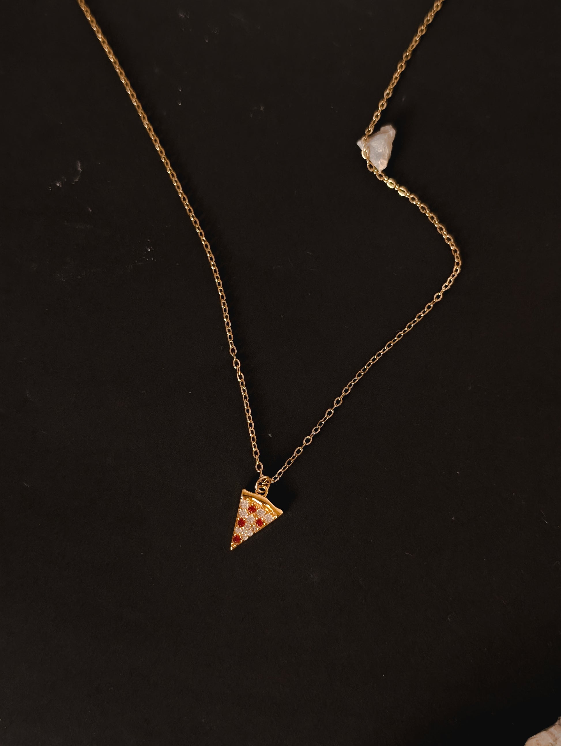 The Cosmic Pizza Necklace features a tiny pizza-shaped pendant adorned with white and red diamonds, blending fine craftsmanship with playful celestial charm. Set on a delicate gold chain, it’s designed to shimmer subtly while making a statement.